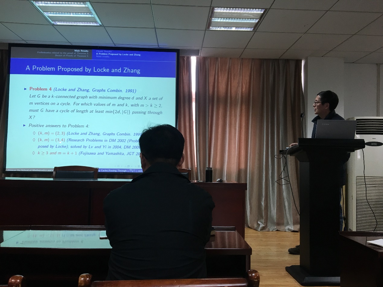 报告中,胡智全教授首先从k连通图入手,向同学们讲述了相关的基本概念,然后重点地讲解了长圈通过k连通图的相关问题,并详细地介绍了论文中相关定理的证明过程。最后提问环节,同学们与胡智全教授展开了激烈地讨论。