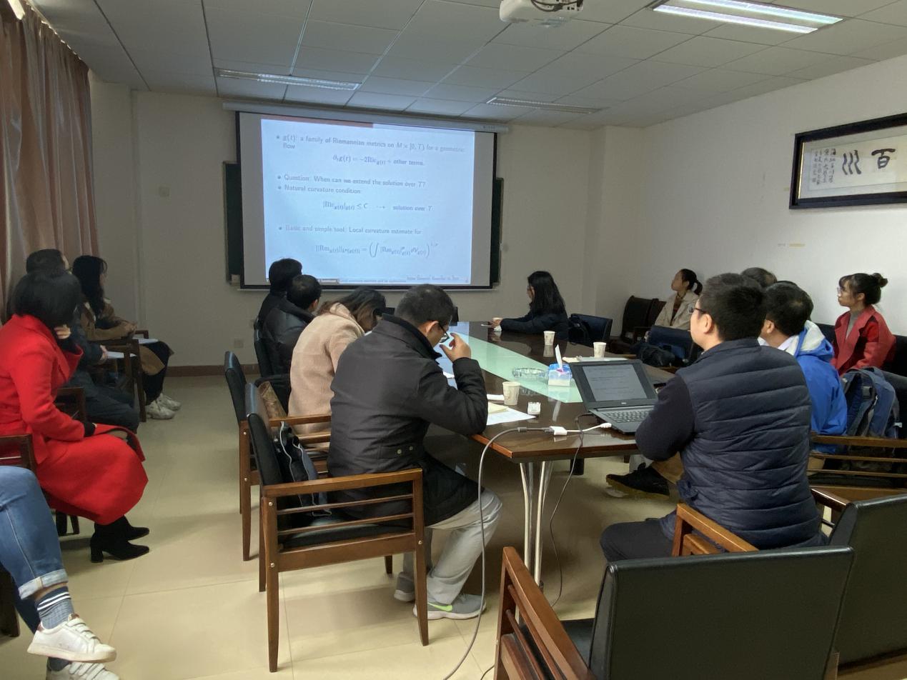 李逸教授的报告题目为“Local curvature estimate and its applications in geometric flows”。报告中,李教授介绍了与Local curvature estimate and its applications in geometric flows相关的一些问题,向我们解释了为什么局部曲率估计在几何流中如此强大,并围绕相关问题与参会师生进行讨论交流。其精彩的内容引起了在场师生的极大兴趣,参加报告的师生与李逸教授讨论了一些相关专业的问题。