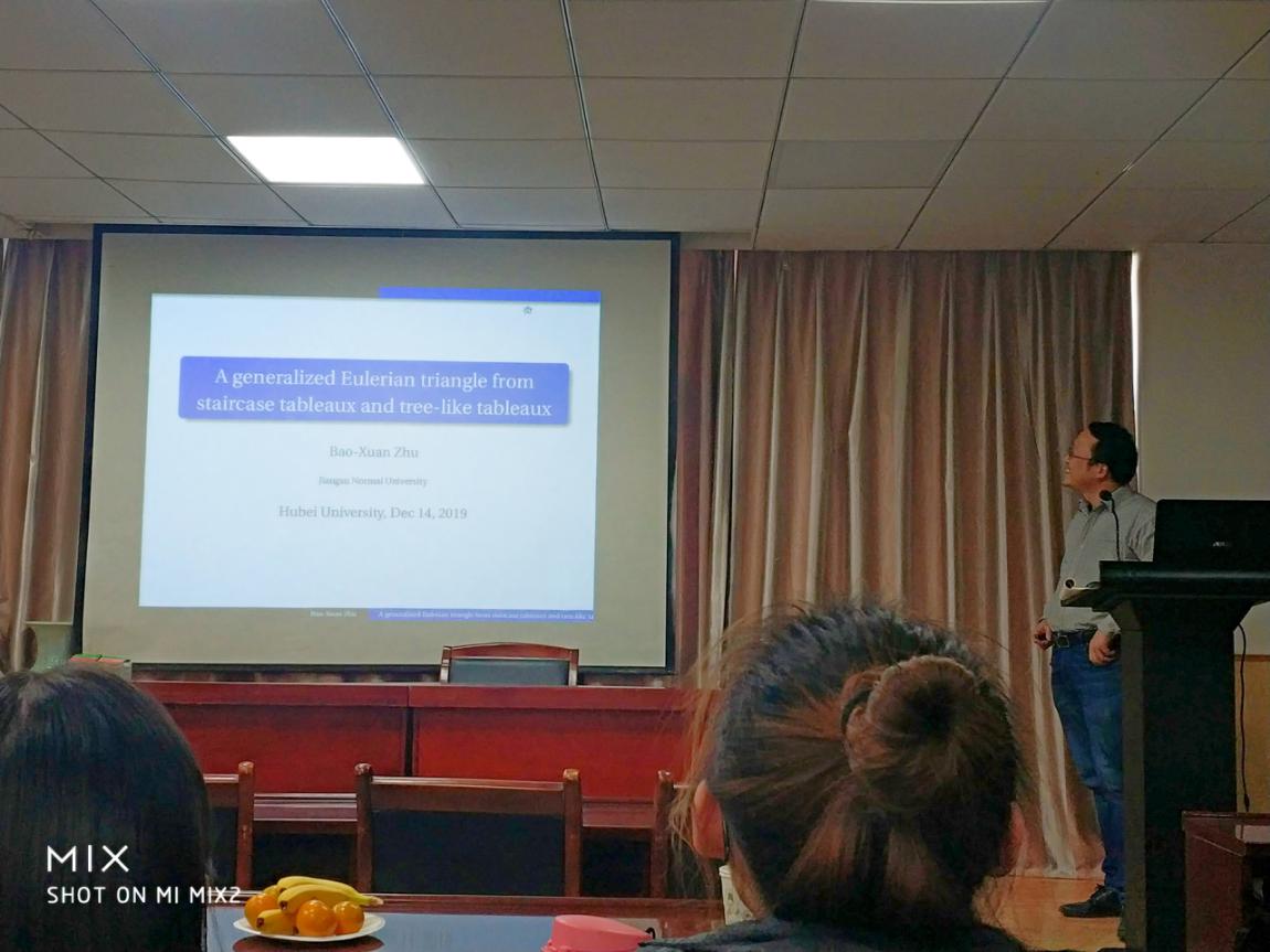 祝宝宣教授的报告题目为“A generalized Eulerian triangle from staircase tableaux and tree-like tableau”,报告中他主要介绍了广义欧拉数的凹凸性等相关结论。祝宝宣教授的讲解深入浅出,形象生动,思维严谨,给公司师生很多的启示。