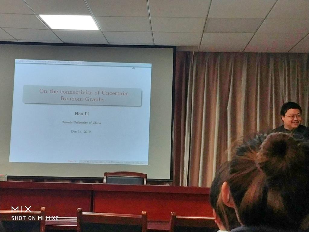 李昊副教授的报告题目为“Connectivity of uncertain random graphs”,报告中他主要介绍了不确定随机图的连通性的一些最新结果。报告结束后,李昊教授还就相关问题与在场的老师们进行了深入的讨论与交流。