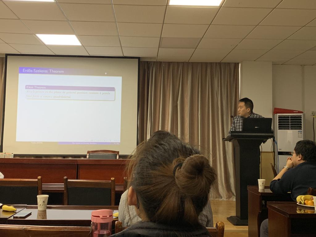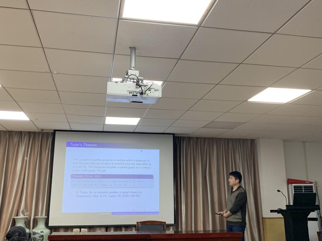 张闫博副教授的报告题目为“Some new results on Ramsey numbers”,报告中,他主要介绍了Ramsey数的一些背景及最新研究成果,并着重介绍了自己科研的一些经验,使在场员工受益匪浅。