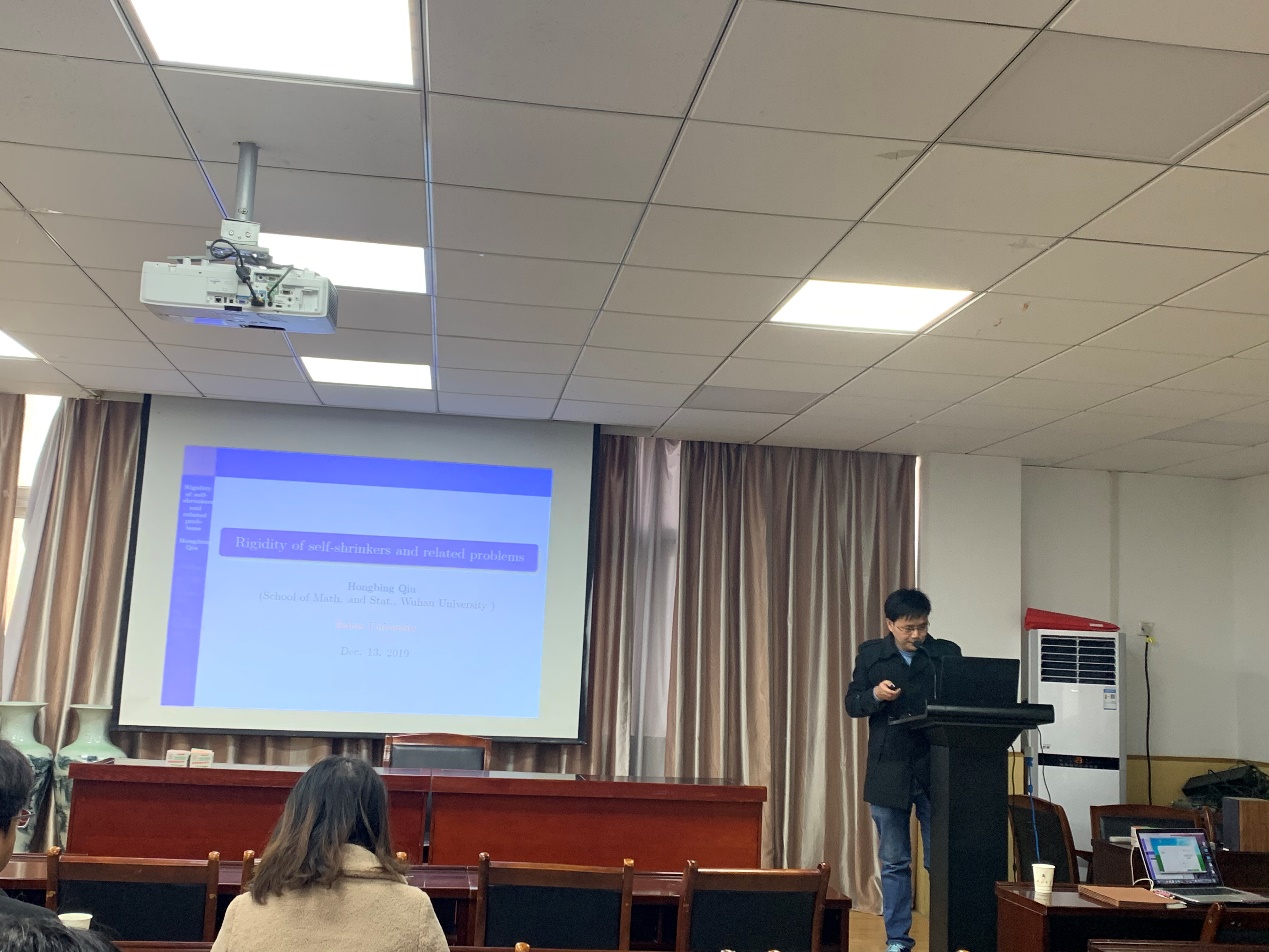 2019年12月的13日下午,武汉大学邱红兵副教授应邀来访公司,并为相关专业的教师与研究生做了题为“Rigidity of self-shrinkers and related problems”的学术报告。