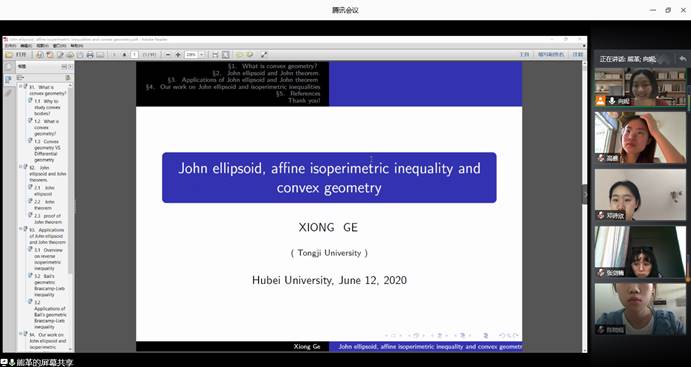 2020年6月12日上午,同济大学熊革教授应公司向妮教授邀请,为公司几何团队作线上学术报告,报告通过腾讯会议举行。会议由向妮教授主持,来自公司几何分析团队的教师、研究生10余人听取了报告并参与了讨论。