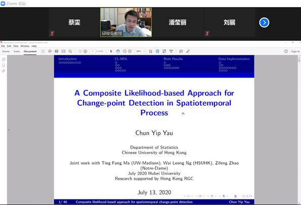 2020年7月13日上午11点,香港中文大学统计系邱俊业教授应公司刘展教授邀请,为公司师生作线上学术报告。报告通过zoom会议在线举行,由刘展教授主持,来自应用统计学专业的教师、硕士研究生等23人参与了报告的听取与讨论。