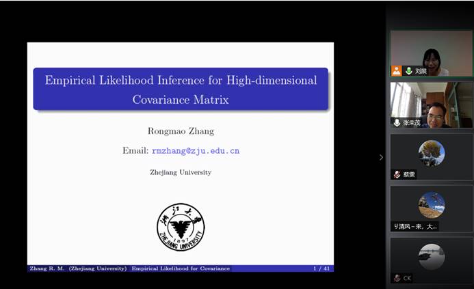 2020年7月17日上午10点,浙江大学数学公司张荣茂教授应公司刘展教授邀请,为公司师生作线上学术报告。报告通过腾讯会议在线举行,由刘展教授主持,来自应用统计学专业的教师、硕士研究生等共35人参与了报告的听取与讨论。