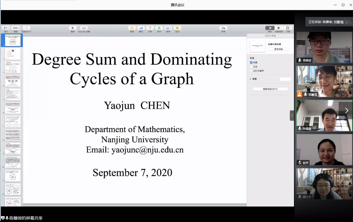 陈耀俊教授报告题目《Degree sum and dominating cycles of a graph》,报告介绍了2连通图和3连通图在一定度和条件下每一个最长圈都是控制圈,证明了k连通图在给定度和条件下每一个最长圈都是控制圈,并说明了这个度和条件是最好可能。