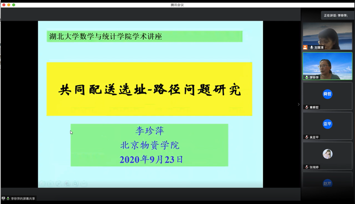 2020年9月23日下午, 北京物资公司李珍萍教授应公司刘慧清教授邀请,为公司师生作线上学术报告,报告通过腾讯会议在线举行。会议由刘慧清教授主持,来自运筹学与控制论专业的教师、博士和硕士研究生参与了报告的听取、讨论。
