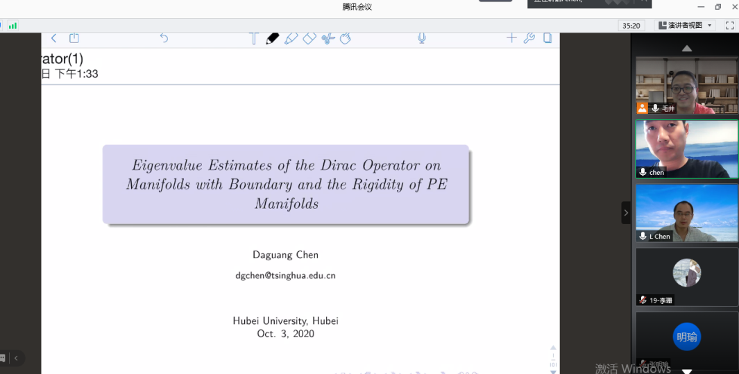 陈大广老师报告的题目为《Eigenvalue Estimates of the Dirac Operator on Manifolds with Boundary and the Rigidity of PE Manifolds》,在这次报告中我们主要讨论了特征值估计及相关刚性问题的内容。陈大广老师首先从四个方面给我们介绍了Dirac算子的相关定义并举出例子;其次,为我们详细讲解了他最近所做带边界流形上Dirac算子的特征值估计与PE流形的刚性问题的主要结论和证明思路;最后,陈大广老师就师生们提出的问题给予了详细的解答。