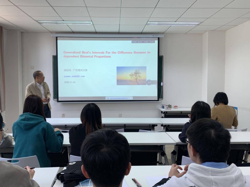 2020年11月14日下午三点,广东海洋大学数据科学系吴延科老师应公司刘展教授邀请,在永利集团304官网203室为公司师生作了一场生动的学术报告。由刘展教授主持,来自应用统计专业的教师、硕士研究生等共17人参与了报告的听取和讨论。
