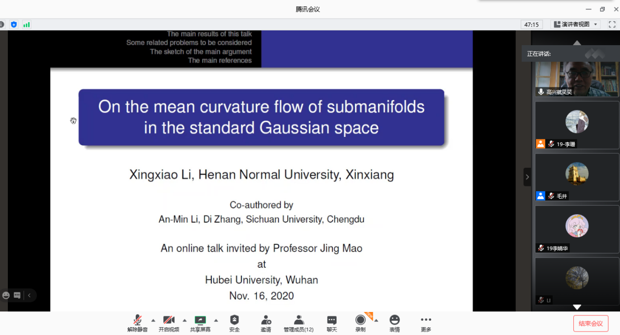 2020年11月的16日上午,河南师范大学李兴校教授应邀为公司相关专业的教师与研究生做了题为“On the mean curvature flow of submanifolds in the standard Gaussian space”的线上学术报告。