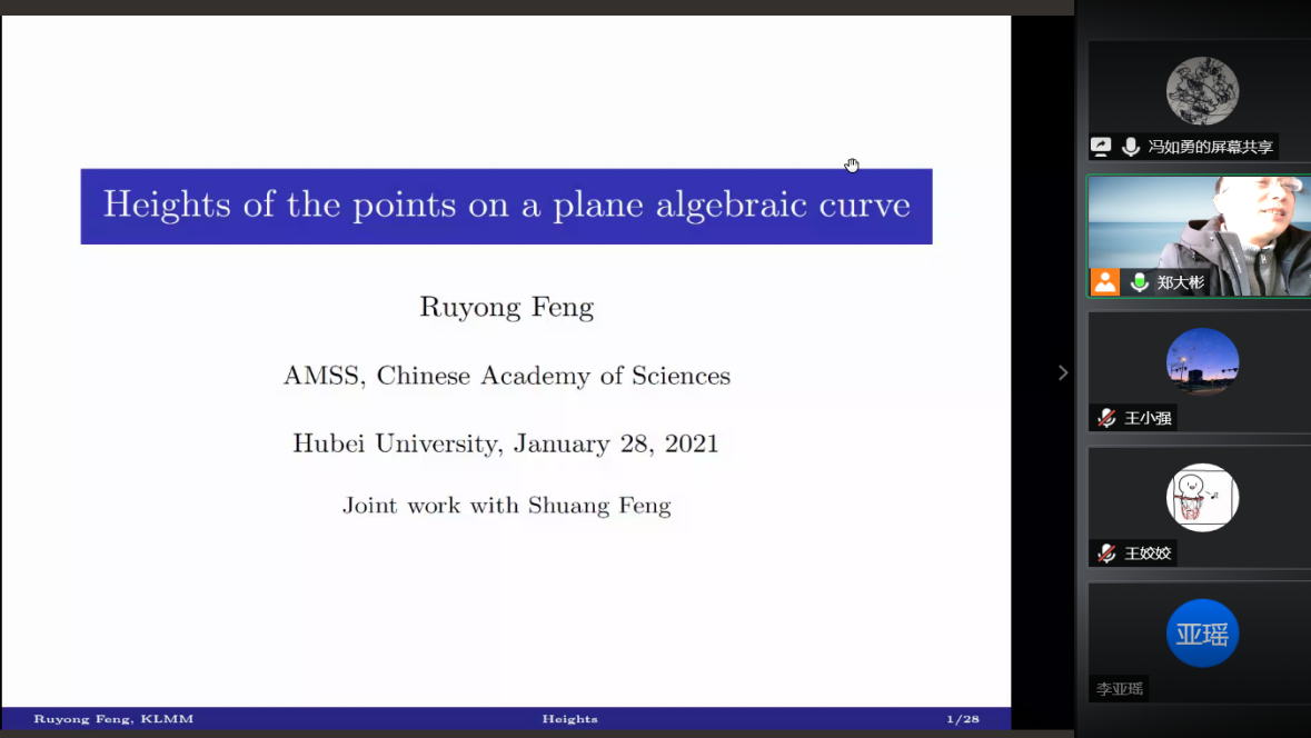 冯如勇研究员的报告题目为《Heights of the points on a plane algebraic curve》,本次报告介绍了有关有理函数次数,有理函数域高度,特征为零的域上的赋值函数以及赋值扩张的基本结果。给出了当赋值都是非阿基米德赋值时,一个不可约多项式中任意两点高度差的估计,进一步讨论了高度在一阶常微分方程有理数解个数的估计中的应用。