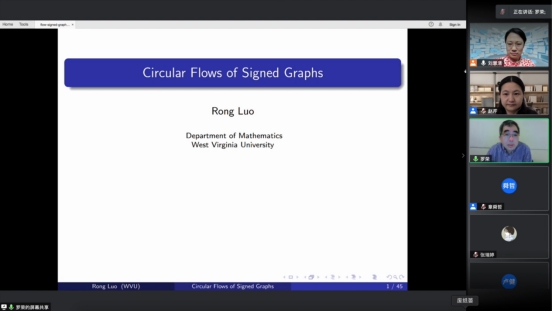 罗荣教授的报告题目是《Circular Flows of Signed Graphs》。罗荣教授从基础的相关概念开始讲,介绍了有关符号图的整数流问题的相关结果以及可以研究的问题。报告十分精彩,老师和同学们对该问题很有兴趣。