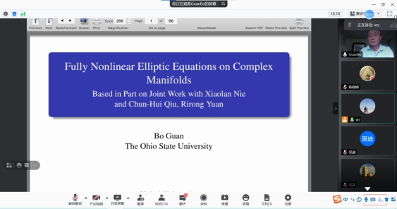 2023年5月25日晚上,美国俄亥俄州立大学关波教授应公司向妮教授邀请,为公司几何团队师生作了题为“Fully nonlinear elliptic equations on complex manifolds”的线上学术报告。