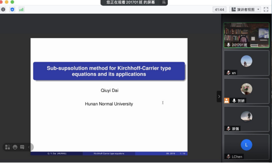 戴求亿教授为几何分析方向的师生做了题为Sub-supsolution method for Kirchhoff-Carrier type equations and its applications的学术报告,为师生详细介绍了一种新的上下解方法,并展示了该方法在Kirchhoff-Carrier型方程的研究中的作用.参会师生表示此次报告极大地开阔了自身的视野收益颇丰.