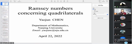 陈耀俊老师的报告题目是《Ramsey numbers concerning quadrilaterals》, 陈耀俊老师首先向大家介绍了报告相关的概念以及研究背景,接着就向大家报告了他们团队关于四边形的ramsey数问题的研究成果。