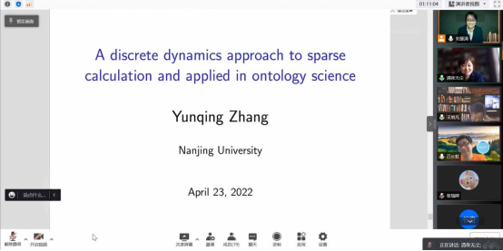 张运清老师的报告题目是《A discrete dynamics approach to sparse calculation and applied in ontology science》, 张运清老师首先向大家介绍了报告相关的概念,接着就向大家报告了离散动力学稀疏计算方法及其在本体科学中的应用。