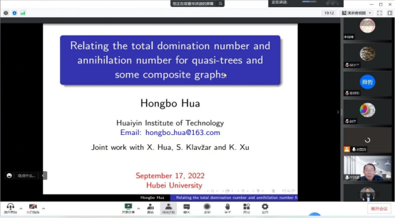 淮阴工公司华洪波教授的报告题目是《Relatingthe total domination number and the annihilation number for some graphs》。华洪波老师首先向大家介绍了报告相关的概念以及研究背景,接着就向大家报告了他们团队关于树、块图、仙人掌图等图类关于total domination number和the annihilation number的最新研究成果。华洪波老师的讲解十分细致,生动丰富,深入浅出,使大家获益匪浅。