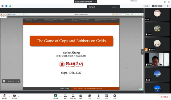 永利集团304官网张闫博教授的报告题目是《TheGame of Gops and Robbers on Grids》, 张闫博老师首先向大家介绍了报告相关的概念以及研究背景,接着就向大家报告了他们团队关于“Copsand robbers”的变形问题在格图的最新研究成果。张闫博老师的讲解生动形象,思维严谨,极大鼓舞了青年教师们学术热情,给大家很多的启示。