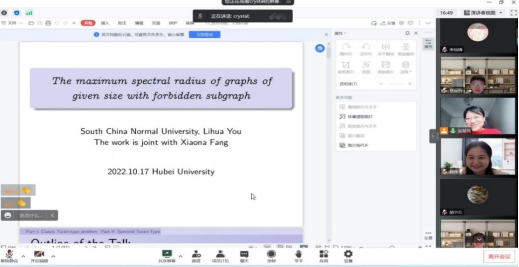 华南师范大学尤利华老师的报告题目是《The maximum spectral radius of graphs of given size with forbidden subgraph》。尤利华老师首先向大家介绍了报告相关的概念以及研究背景,接着向大家报告了他们团队关于在给定边数及禁用子图条件下的最大谱半径问题的最新研究成果。尤利华老师的讲解生动形象,思维严谨,极大鼓舞了青年教师们学术热情,给大家很多的启示。