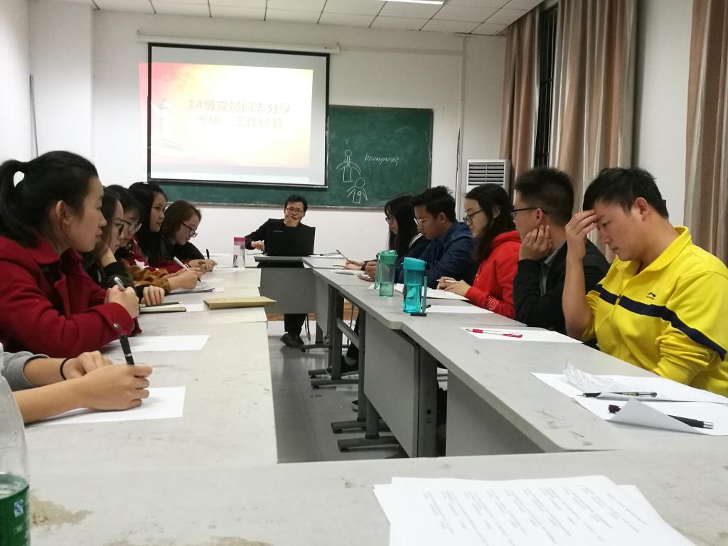 首先,由第三党支部王颖同志通报本次党组织生活党员到会情况。接下来到会党员重温入党誓词,由第三党支部贾文娜同志带读。然后14级党员同志依次发表了自己的考研、保研以及工作经验,涉及内容有考研阶段的心态调整,备考的学习方法以及身体的重要性等方面。紧接着15级党员依次了分享自己的规划,立足于当下应该怎么做,有的选择考研,就要树立自己的目标,早做准备,有的选择就业,应该提高自己的能力。最后,到会党员分成两组,进行十九大党章修改相关的知识竞答,党组织生活圆满结束。