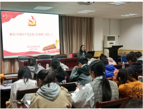 2019年4月28日晚,永利集团304官网第七期入党积极分子培训班第六讲在数统201报告厅开讲。此次党课学习邀请了数统院的辅导员马荣老师为学员们作《中国共产党支部工作条例(试行)》辅导报告。