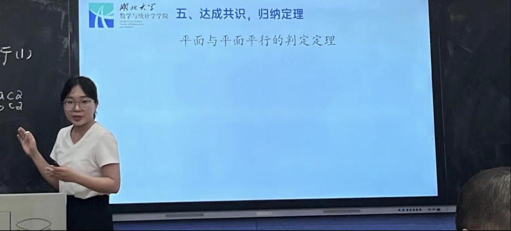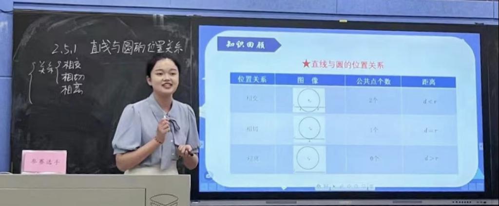 荆源以“直线与圆的位置关系”为主题,通过游船航海问题出发,讲解了用几何法和代数法两种方法判断直线与圆的位置关系,贯穿数形结合思想,内容连贯,逻辑清晰;邓子怡从生活中如何判断桌面与地面平行的实例引入,通过层层递进的问题揭示了“平面与平面平行的判定定理”,过程中将直观感知与思辨论证结合,转化的数学思想方法贯穿始终。两位选手均获得二等奖的好成绩。