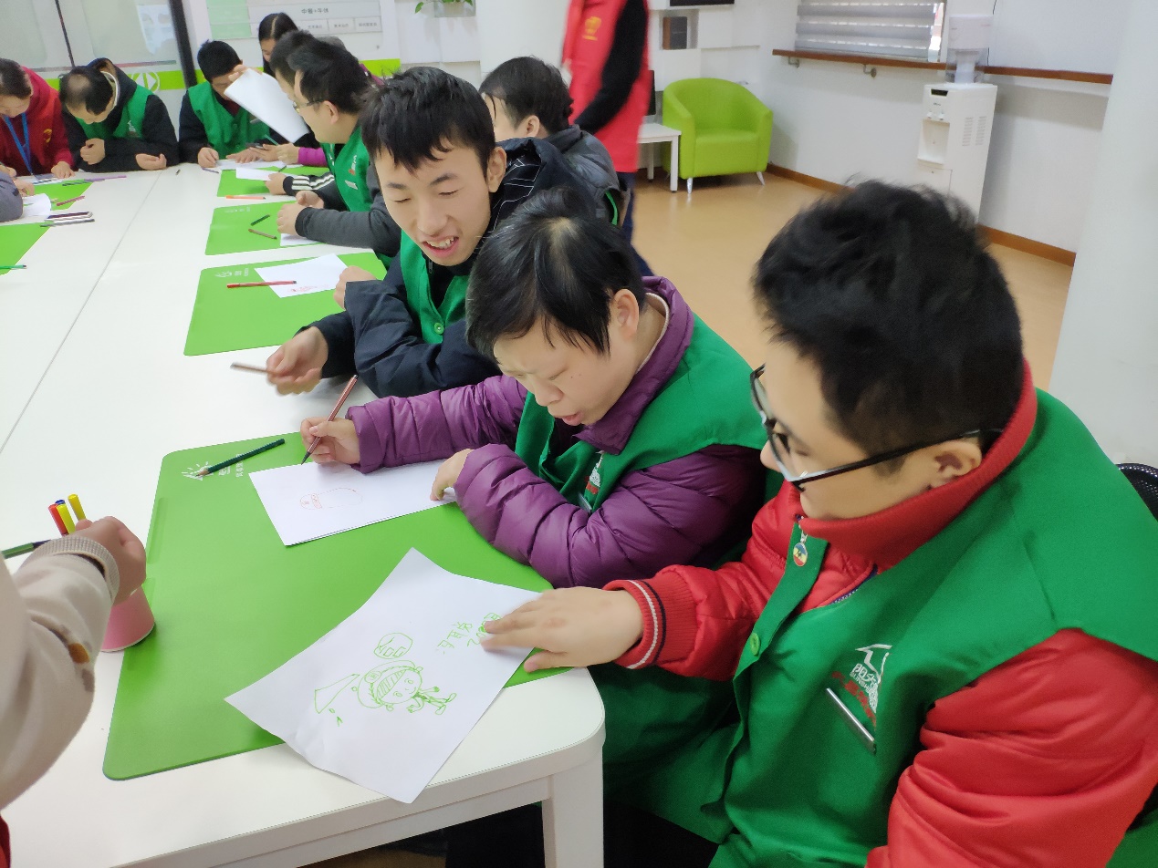 活动开始,志愿者分组展示,通过现场情景模拟方式重现了日常生活中诈骗行为的三种常见方式,包括电信诈骗、马路行骗、人贩拐卖等。每场模拟后,主讲人向帮扶对象提问遇到这类情况应如何处理,志愿者点评其做法,指出其中不足并教授其正确做法。第二阶段,志愿者引导服务对象发现生活中常见的其他诈骗行为并逐一分析。主讲人针对其中涉及较多的问题进行汇总并统一说明,通过提问互动方式验收服务对象学习成果。第三阶段,服务对象绘画卡通警察形象,并由此编排“警察与骗子”小型剧场。最后,在游戏“逛三园”中,志愿者圆满结束了本次课程。