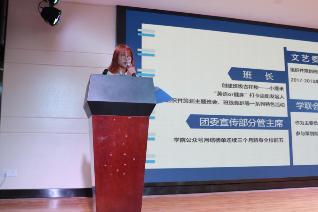本次汇报展示一共有18位候选人,展示结束后现场观众会为自己心仪的10位汇报人投出自己宝贵的一票。人生在勤,不索何获。在展示环节,18位候选人分别从思想、学习、员工工作、社会实践等四个方面展示自己耀眼的成果。每一位汇报人都向我们展示出一颗热爱祖国,乐于奉献的心,他们积极参加公益活动——幼儿园、敬老院、贫困山区都可以看到他们的身影。老子在《道德经》中写道:“天行健,君子以自强不息”。付出就会有收获,努力一定会有回报。国家奖学金、优秀员工奖学金,还有更多校级、省级、国家级的荣誉,坐在台下的大家除了心潮澎湃之外,更应该知道每一个荣誉背后都是无数个奋斗的日日夜夜,更应该看到每一位同学汇报结束后脸上坚定而从容的微笑。