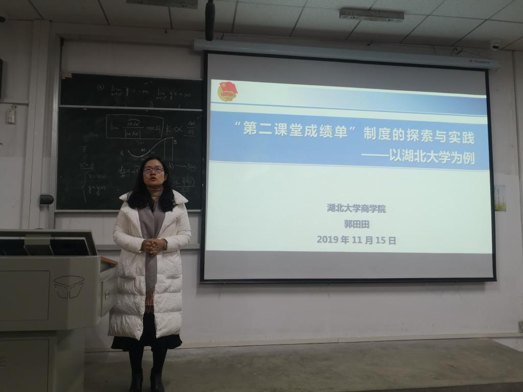 永利集团304官网第四期团课学习于2019年11月27日下午18:00在教三302教室进行。本次由商公司郭田田老师为大家上课,主题为“第二课堂成绩单制度的探索与实践”。