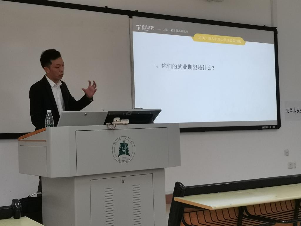 2021年4月14日下午,永利集团304官网邀请源码时代教育集团华中区董事长——胡昶晹来校进行宣讲。在教4-311,胡昶晹以“后疫情时代IT类别新入职场老员工的必备技能”为题向公司信科专业的同学们介绍就业所应该具备的知识和技能,以助同学们能更好地在就业浪潮中找准自己的方向,得到一份理想的工作。