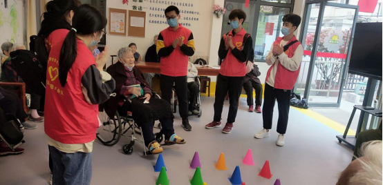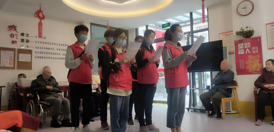 暖阳志愿服务队一行人来到养老院,养老院老人们非常开心,齐声朗诵的《党在我心中》声情并茂,老人们都安静倾听。朗诵完成后,一位很精神的老爷爷上前带着方言口音说:“你们朗诵的真好啊!”之后,服务队队员还和老人们合唱了《北京的金山上》、《我的中国心》、《我和我的祖国》、《红梅赞》等爱国歌曲,一位老人拿着麦克风唱得不亦乐乎。一位坐在轮椅上的老奶奶激动地说:要感谢党的好政策,让我们在这里啥心不操,吃的好、住的好,还可以和大家一起娱乐。随后,队员们还和老人们玩起了套圈游戏,现场气氛十分热闹。