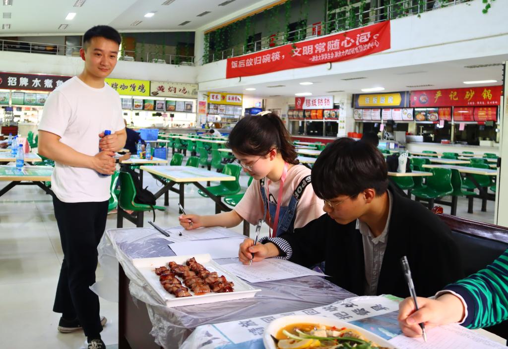 4月末的天气已经有了浓烈的夏天气息,在露天争霸赛场上,各员工团队比赛菜肴的制作更加热火朝天。裹满番茄汁的肉丸,黄色杨桃刻出五角星模样,摆成“100”字样的薯条,2019级美术学专业徐海璐与2019级英语教育专业余思蕾别有心意制作参赛作品“胜利果实”,别出心裁摆盘,象征人民群众团结一致,爱党、拥护党的心,以此献礼中国共产党成立100周年。在众多参赛作品中,还有重述当年长征故事、饱含红色基地风味以及中华民族悠久历史的特色菜肴,满目琳琅。
