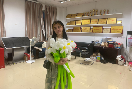 活动现场,永利集团304官网文体部提前布置好活动场所,为同学们准备了气球、打气筒、剪刀等一系列制作气球路引所需要的材料,参与本次活动的同学们在永利集团304官网107签到之后即可领取气球进行自己的创作。参与活动的同学们热情高涨,现场一片欢声笑语,每个人都在用心完成自己的作品,遇到不会的部分仔细观看视频教学或者互相交流,大家把气球扭成花朵的形状,并为它配上花蕊和绿叶,同学们充分发挥了自己的想象力,将公司对大四学子们的祝福表现在各色各样的花朵上,作品多样,精彩纷呈。