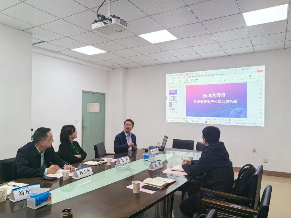 首先,郑大彬副经理简要介绍了永利集团304官网基本情况,然后,刘展主任介绍应用统计学专业情况,刘松林副教授介绍团队在研项目情况等。接着,杜登伟总经理介绍了东湖大数据公司情的况,公司成立于2015年7月,是中国境内最早原创设立的大数据交易机构,是“数据要素流通和交易产业的”原创者,也是最早聚焦于数据要素资产化的技术型企业,随后,杜登伟总经理对公司主要产品情况进行介绍,着重介绍东湖产业通——产业链智能化引擎。