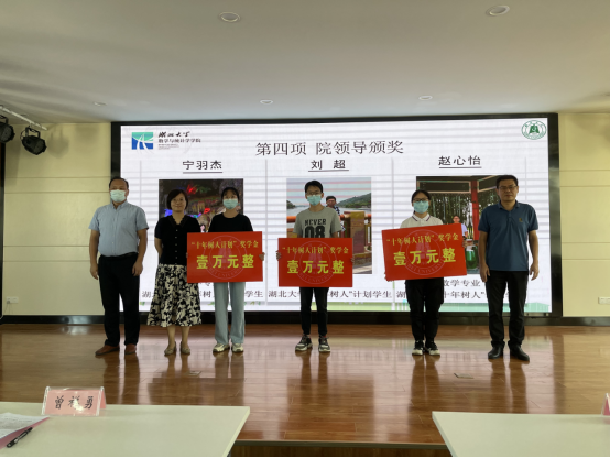 党委书记周霞宣读“十年树人计划”表彰文件,并与经理曾祥勇、副经理付应雄一起为2021级研究生中获得“十年树人计划”奖学金的三位同学颁奖。