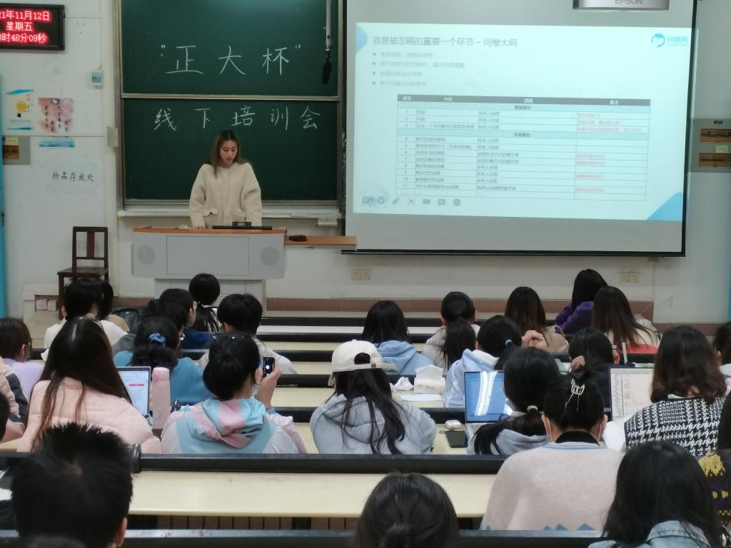 2021年11月12日晚18:30,公司组织开展了“正大杯”第十二届全国市场调查与分析大赛赛前指导工作,上海众言网络科技有限公司的拓丽霞、王童文指导专家团队在永利集团304四号教学楼309对参加本次正大杯比赛的同学进行了以“调研与分析那些事儿”为主题的赛前培训。